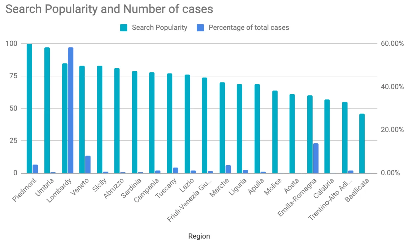 Graph shows the search popularity for private healthcare related keywords by Italian region from 12th Feb - 9th March 2020, vs the number of confirmed coronavirus cases (as of 11th March) (source ).