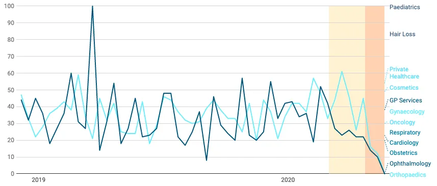 The areas that appear to have most significantly and obviously lost search volume are ophthalmology and orthopaedics. This makes some degree of sense, with public pressure being put on to postpone elective surgeries, patients with very physically presenting symptoms (such as orthopaedic and ophthalmological patients) appear to be more willing to stay at home and view their conditions possibly as less urgent.