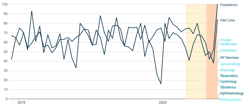Counterintuitively, there are some specialties that have seen a boom in search popularity during the COVID-19 crisis. Specifically cosmetic hair loss and paediatrics. It would make sense that these two distinct areas have seen a benefit for different reasons…